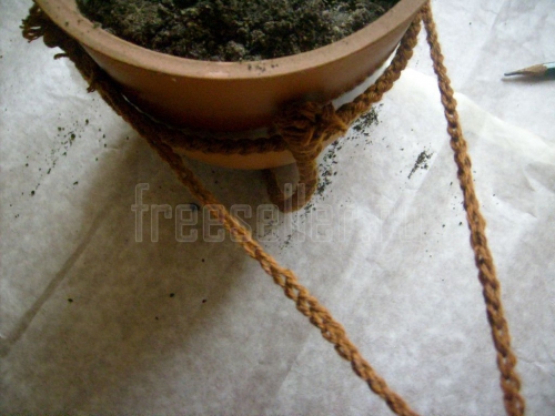 5. Крепим к поперечному шнуру над одним из шнуров основы несколько нитей пряжи. Плетём шнур достаточной для подвески горшка длины. Крепим его конец к поперечному шнуру напротив его начала.