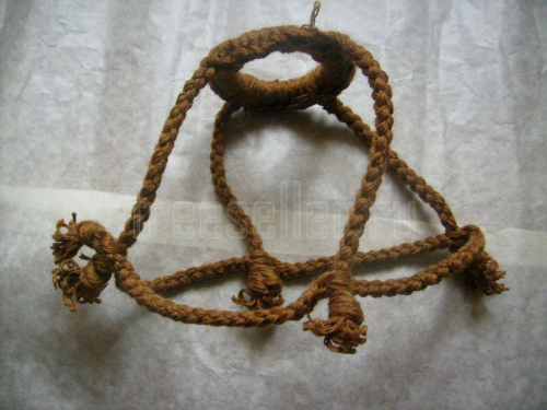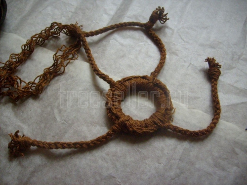 Продолжаем плетение поперечного шнура, крепя его по ходу работы к шнурам основы по очереди. Заканчиваем плетение узлом на первом шнуре основы. Обрезаем нити.