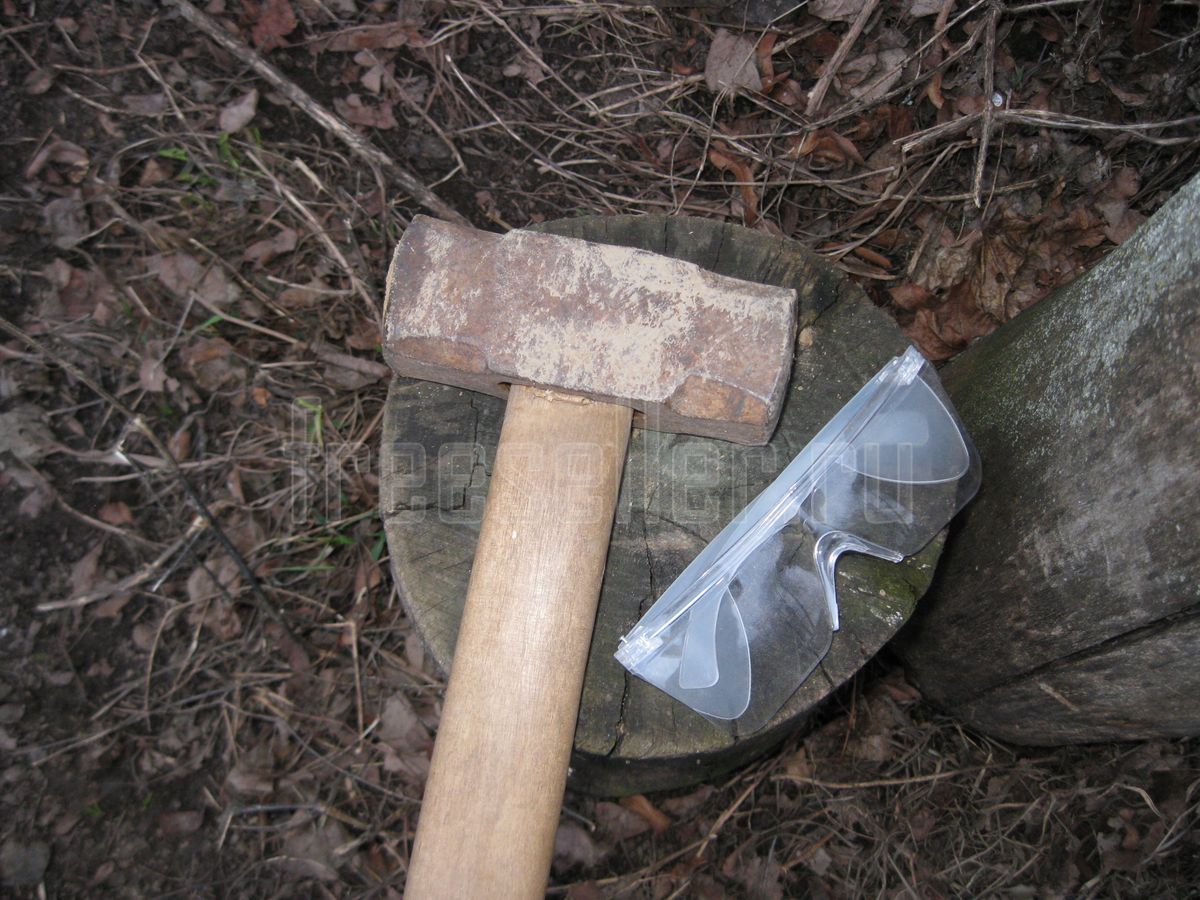 Для корчевания пенька нам понадобится всего два предмета: кувалда и очки для защиты глаз, поскольку при ударах кувалды могут разлетаться мелкие частицы земли.