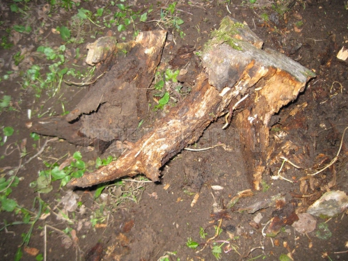 Во время этих ударов сеть подгнивших корешков, проходящих под землей с этой стороны пенька, рвется так, что пенек с каждым ударом начинает немного вылезать из земли.