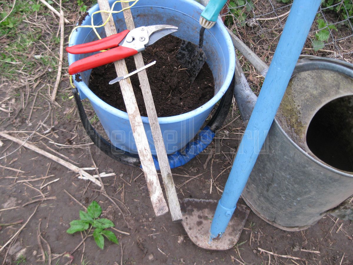 Для этого из материалов мне понадобятся, примерно половина ведра смеси земли и перегноя, половина полива на воды и два колышка с веревками.