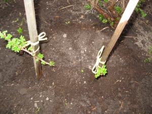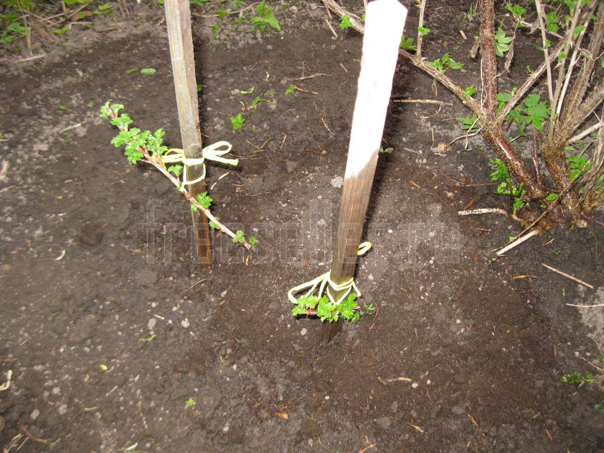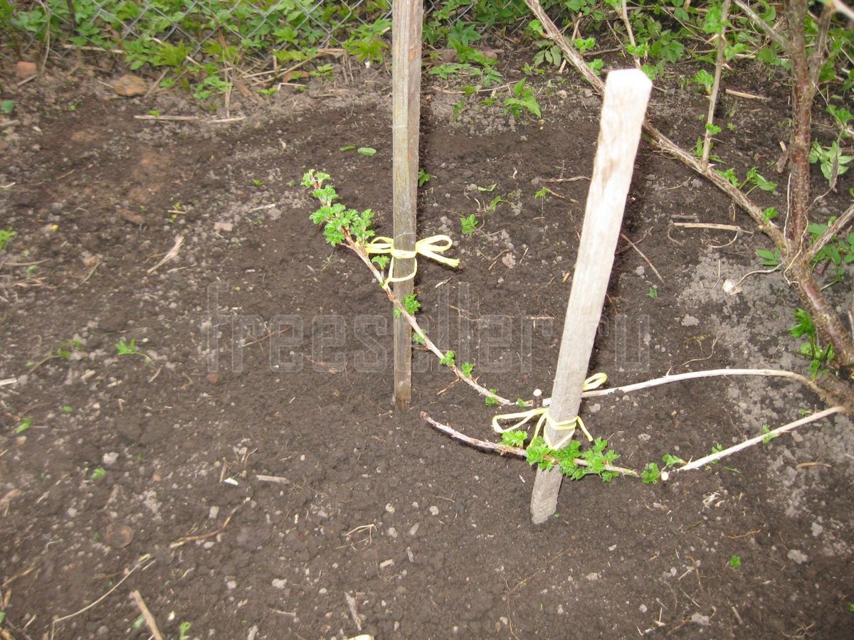 Затем нужно воткнуть в землю колышки и подвязать к ним при помощи веревки кончики веточек свободной восьмеркой (то есть так, как обычно подвязывают к колышкам все саженцы). Таким образом, мы сформируем из прикопанных отводков, своеобразные дуги (откуда и пошло название этого способа размножения).