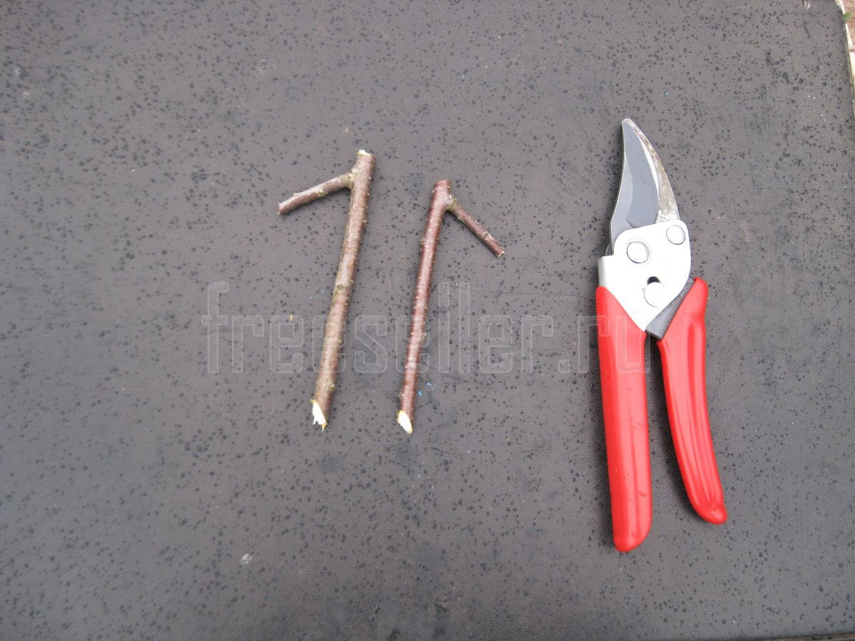 После этого, нужно заготовить крючки, которыми мы будем пришпиливать ветки к земле. Для этого можно использовать проволоку, но проще вырезать такие крючки при помощи садового секатора из веток плодовых деревьев, предназначенных на весеннюю обрезку или уже срезанных.
