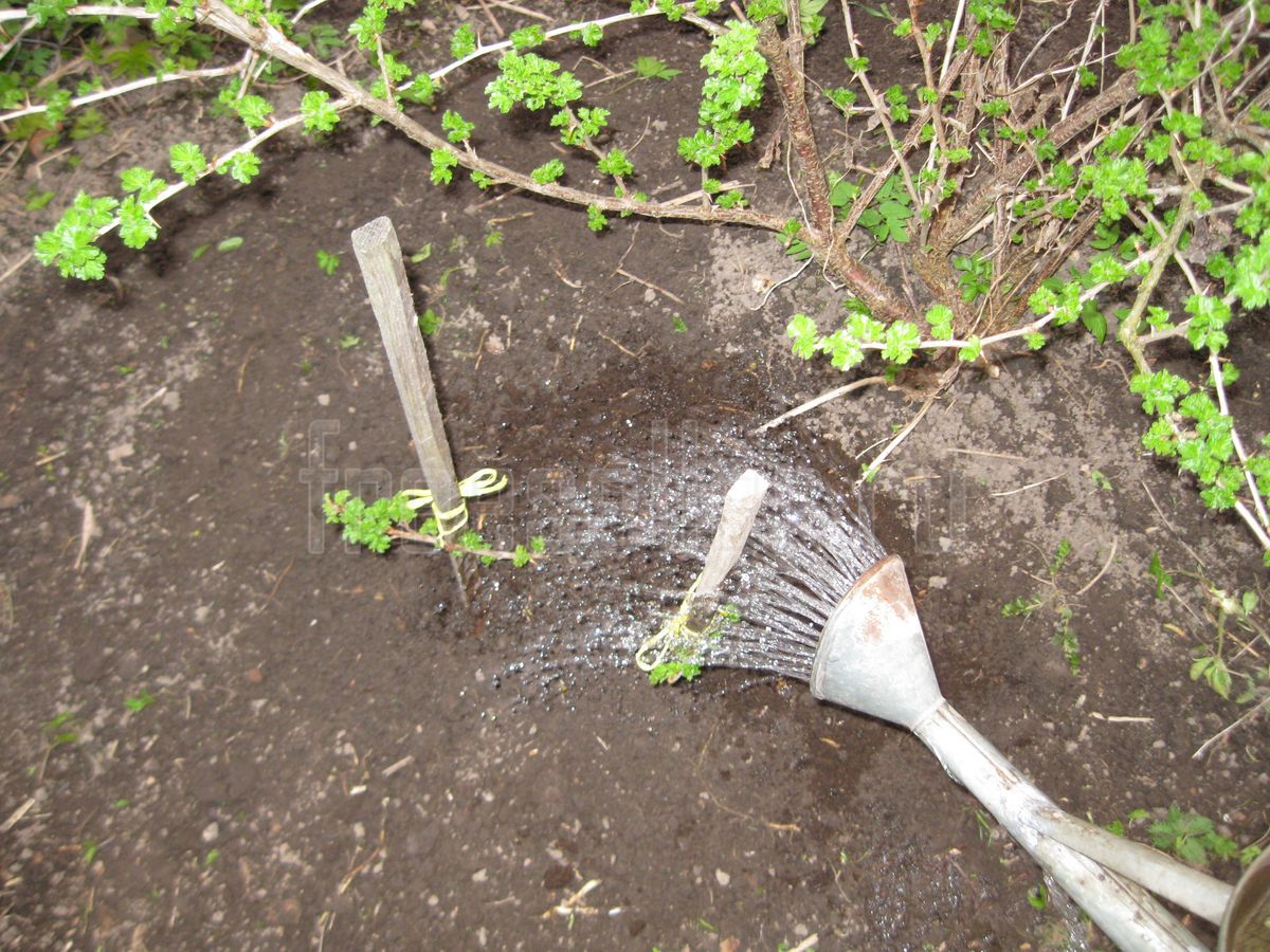 Затем нужно полить пришпиленные к земле участки наших отводков. Так смесь земли с перегноем, которой засыпаны наши отводки, осядет и заполнит все пустоты, а заодно и увлажнится, что будет способствовать быстрому образованию корней.