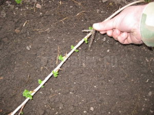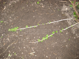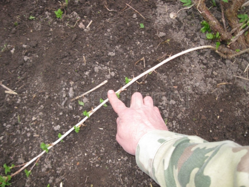 Для начала, необходимо пригнуть эти веточки к земле и примерно отметить место, где они будут прикопаны, а также участок каждой веточки, который будет прикопан.