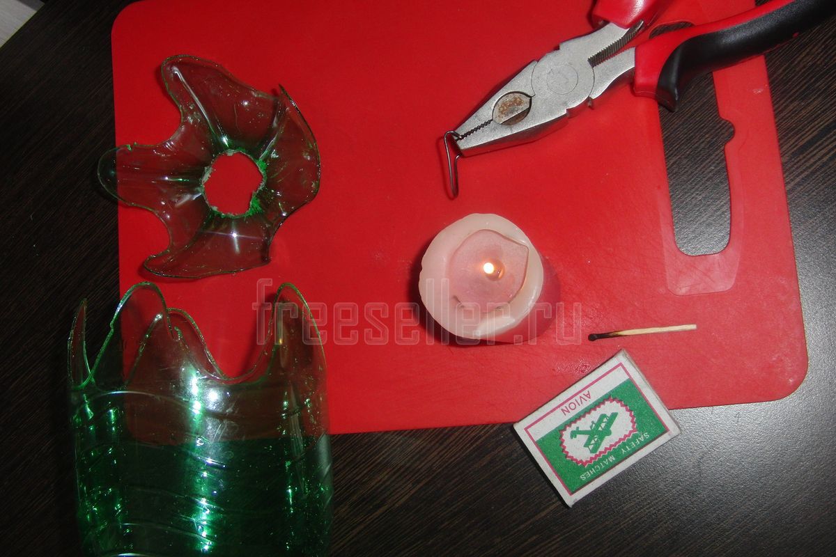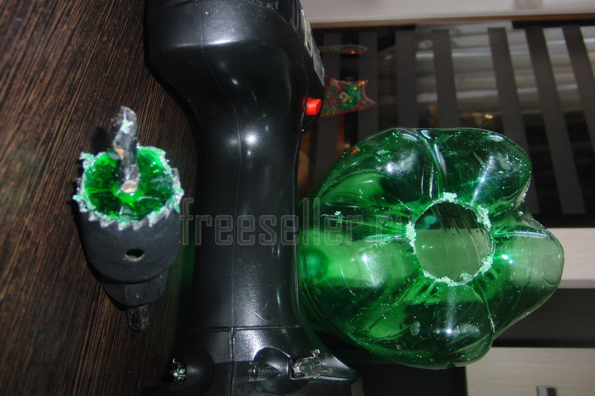 С помощью коронки высверливаем отверстие на дне бутылки под размер горлышка такой же пластиковой бутылки. Нагретой на свече проволокой разрезаем бутылку на три части.