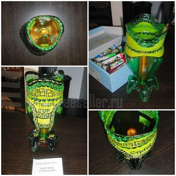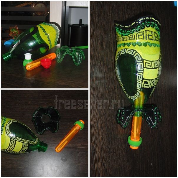 Колба с системой соединённых трубок внутри отлично входит в крышку из-под пластиковой бутылки. Превращаем нашу бутылку в чашу, соединив все её части, как на фото. В процессе сборки чаши нашлась и крышка нужного цвета.