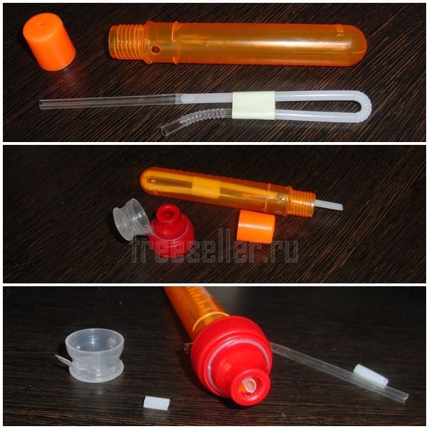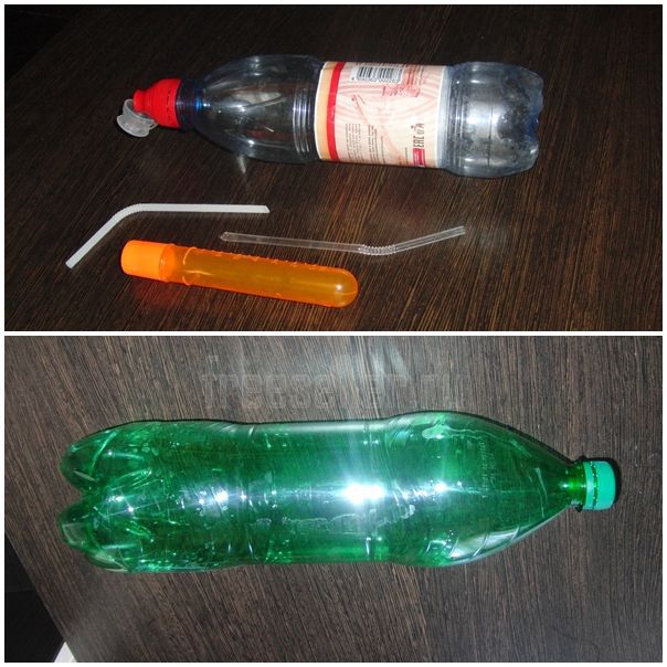 В колбу из-под мыльных пузырей, вставляем трубочки для сока, соединённые как на фото. Один конец трубочки вставляем в отверстие, проделанное в колбе возле самой крышки, а второй конец трубки будет выходить из крышки.