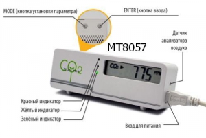 MT8057 представляет собой точный прибор, для измерения в составе воздуха концентрации CO2. Прибор оснащен жидкокристаллическим дисплеем, для точного контроля и тремя индикаторами, для оперативного контроля концентрации углекислого газа. В качестве приятного дополнения прибор показывает состояние температуры в месте его установки. При необходимости, с помощью кнопок управления можно изменить включение индикации оперативного контроля.