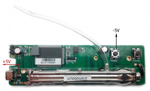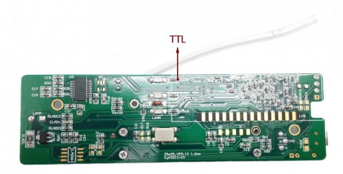 Второй провод подпаиваем к выводу кнопки ModeKey подключенной к общей шине платы. Третий вывод подпаиваем к среднему контакту элемента THRO, рис. 6.