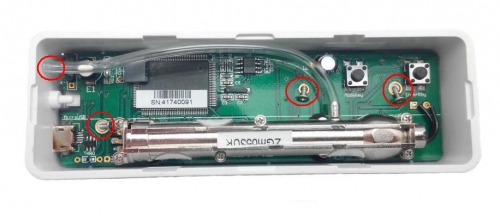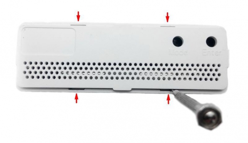 Для подключения силового реле нам потребуется разобрать MT8057. Для этого, необходимо с помощью маленькой отвертки отогнуть защелки в пазах корпуса датчика рис. 3.