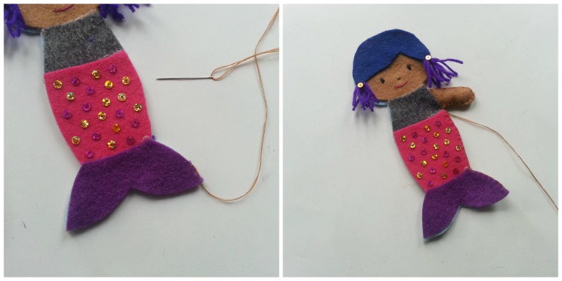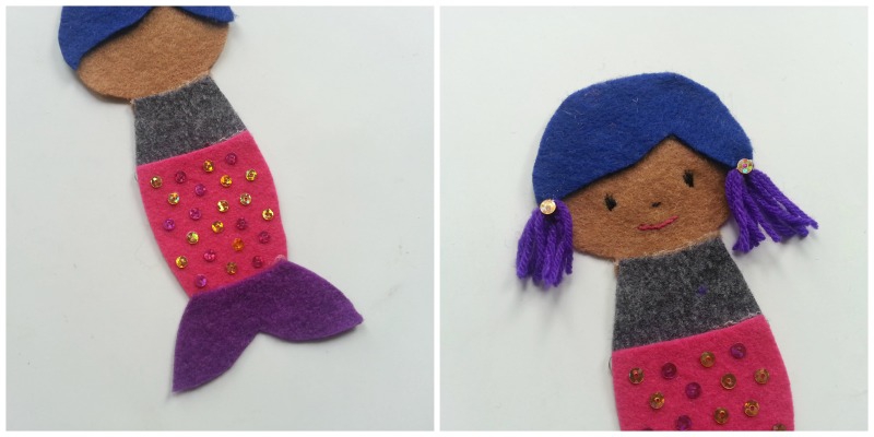 Украсьте русалку пайетками. Приклейте пайетки к хвосту русалки. Сделайте волосы из шерстяных ниток. Соберите их в маленькие пучки и пришейте к голове русалки. Нарисуйте лицо и вышейте его.