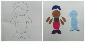 Приготовьте шаблон для куклы. Вырежьте из разных кусочков фетра или ткани части тела для передней заготовки куклы. Приготовьте заднюю часть для куклы, её можно также собрать из разноцветных кусочков или приготовить один сплошной шаблон в виде русалки. Для рук сделайте 4 разных заготовки.