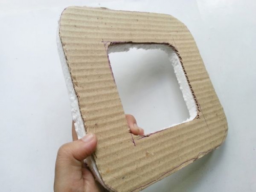 Вырежьте заготовки из картона и пенопласта. Приклейте их друг к другу. Форму выберите произвольную.