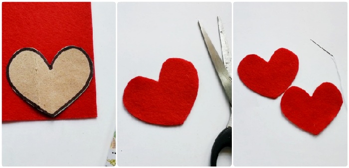 Сделайте небольшой шаблон сердечка. Приложите к фетру или ткани. Обведите. Вырежьте два сердечка.
