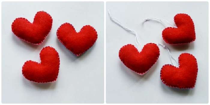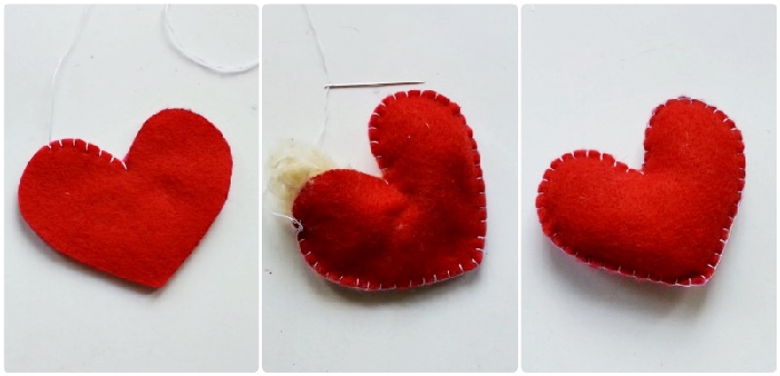 Прикрепите два сердечка друг к другу. Начните пришивать белыми нитками по краям сердечка. Оставьте небольшое отверстие для наполнения. Наполните сердечко ватой или кусочками фетра или ткани. Наполняйте пока сердце не станет воздушным. Зашейте отверстие. Отрежьте лишние нитки, закрепите.