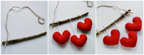 Приготовьте веточку. Прикрепите сердечки к веточке. Также прикрепите к концам веточки верёвку, на которую можно будет подвесить украшение. Украшение готово!:)