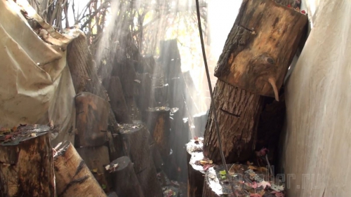 Делал пропилы бензопилой.( не делайте так – лучше после замачивания мицелий на торец и в пленку, потом в прохладное место пока пенек не обрастет, а потом уже на постоянное место).