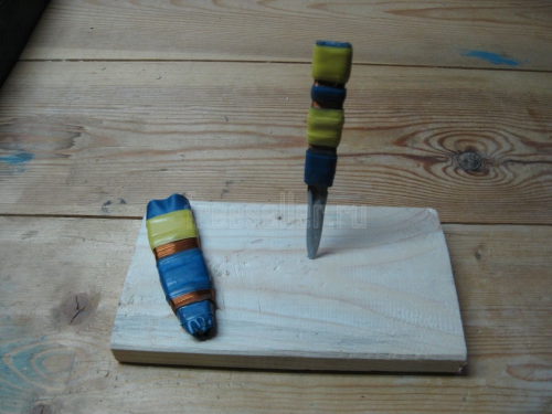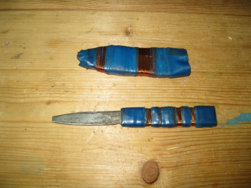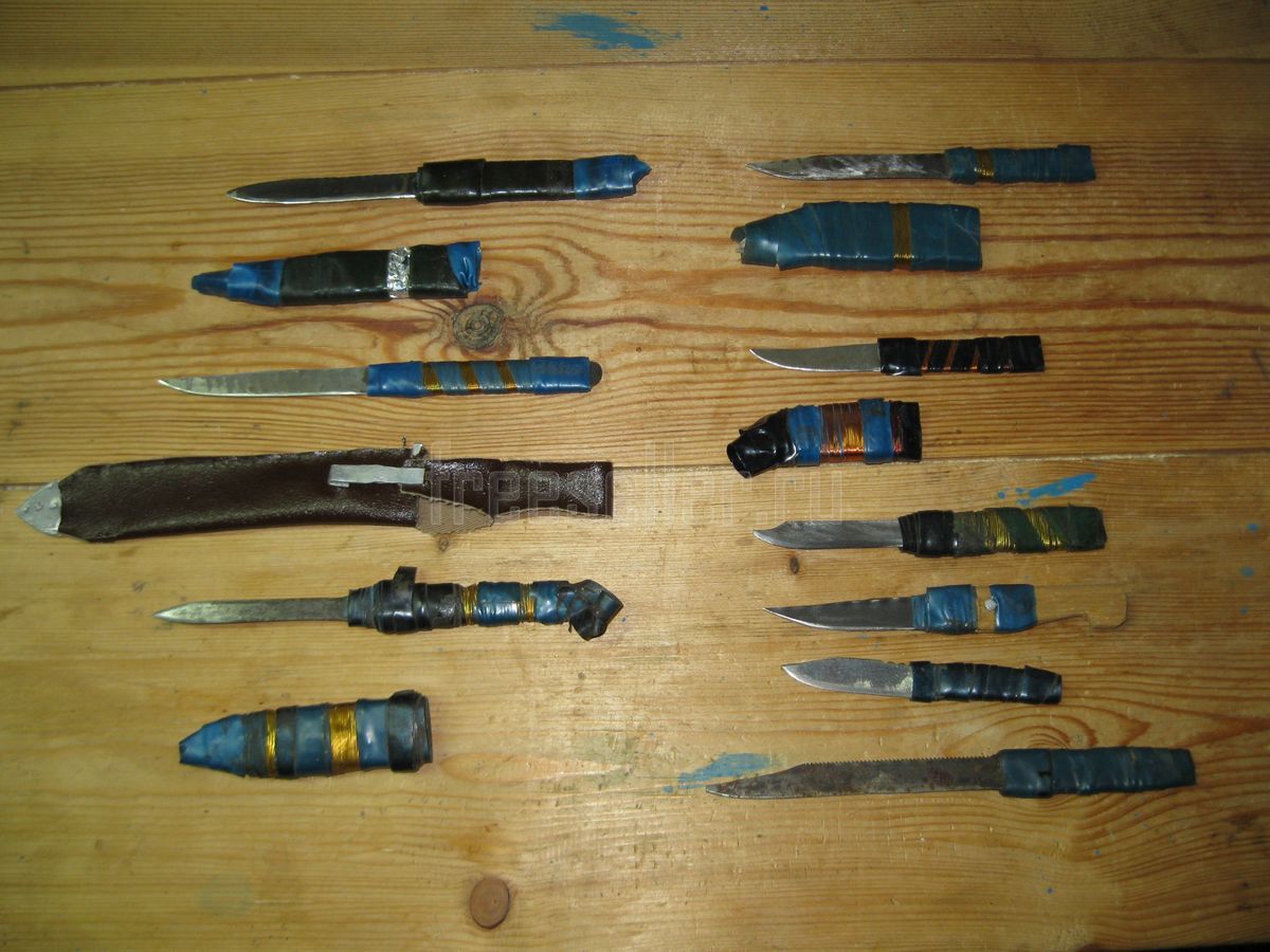 Как видно, у него практически на всех ножах такого типа, ручки сделаны из проволочной обмотки и изоляционной ленты, что может и не очень красиво, но достаточно практично. У многих ножей также есть ножны, основа которых сделана из полос твердой резины, а сверху опять же обмотка из изоленты и проволоки.