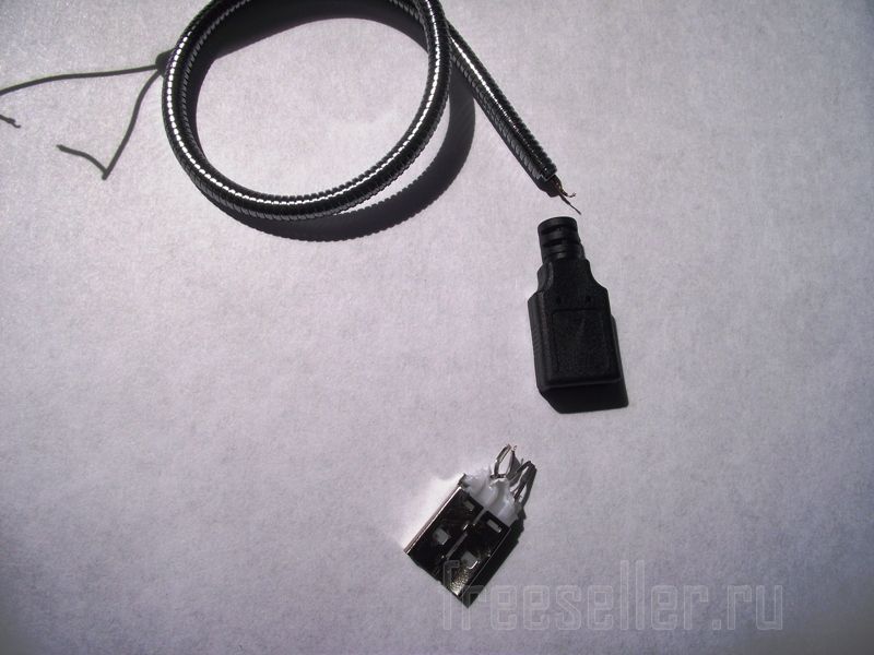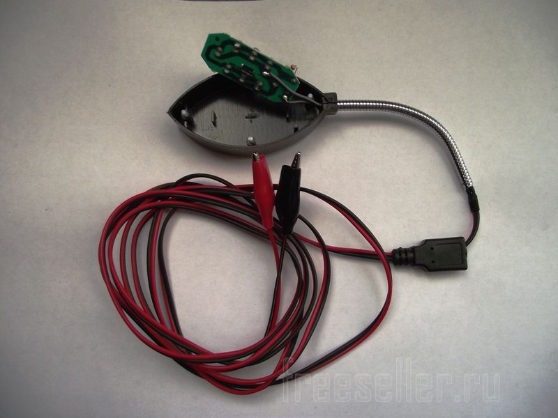Он продаётся в магазинах всё по одной цене. Так же провод и крокодилы. Сначала светильник нужно разобрать. Для этого нужно пассатижами вырвать из USB-штекера контакты, корпус светильника и корпус штекера снять с гофры. Они просто скручиваются как по резьбе. Саму гофру можно укоротить.