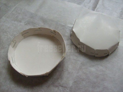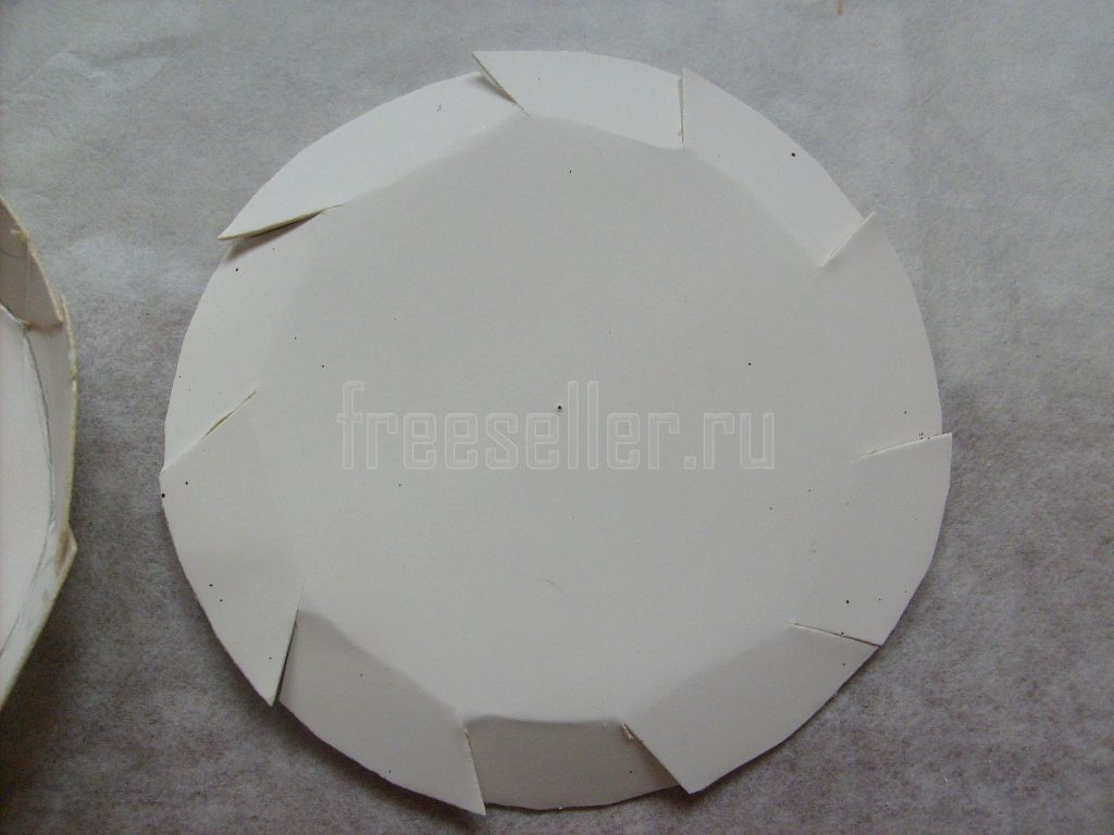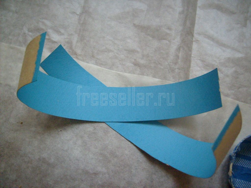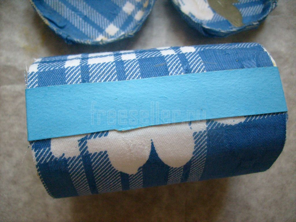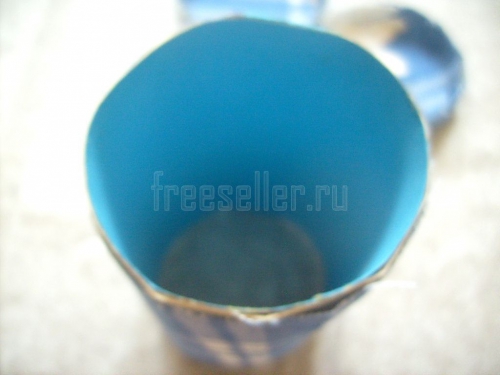 Оклеиваем ими края цилиндра. Сначала наклеиваем каждую с внешней стороны по кругу до середины её ширины, затем загибаем её вовнутрь и прикреиваем там.