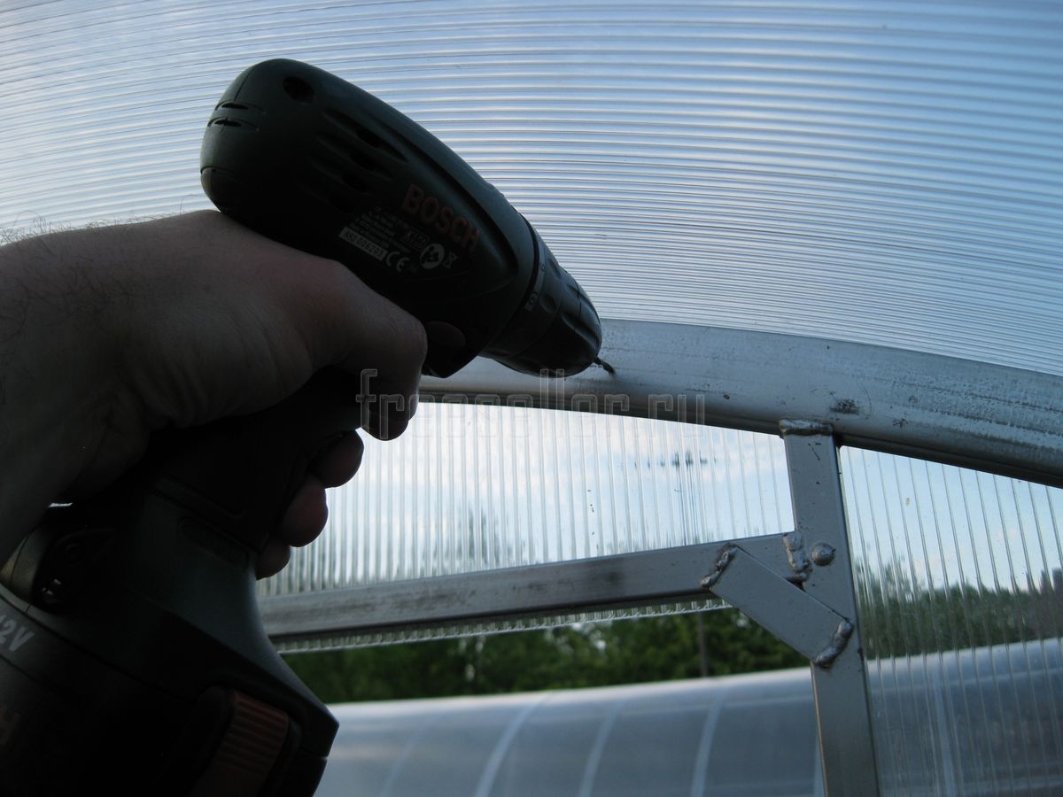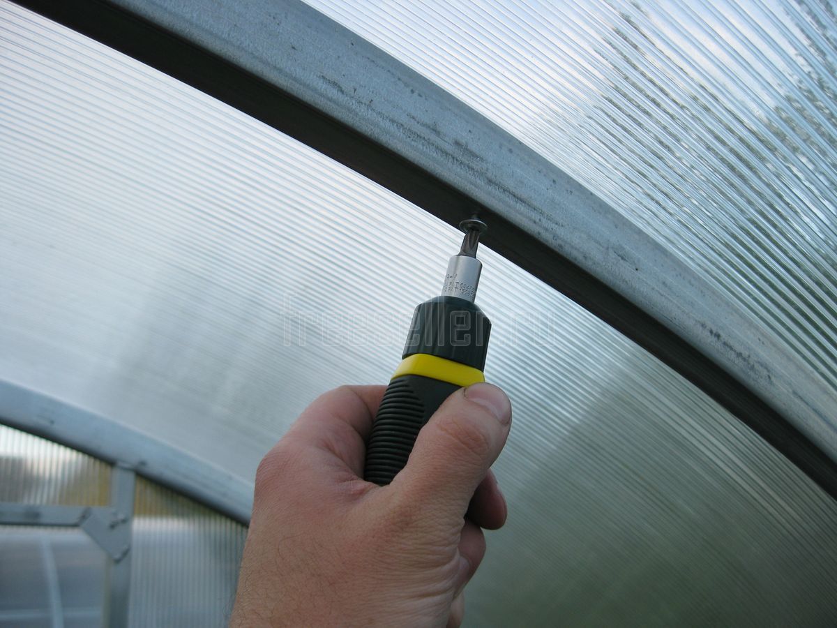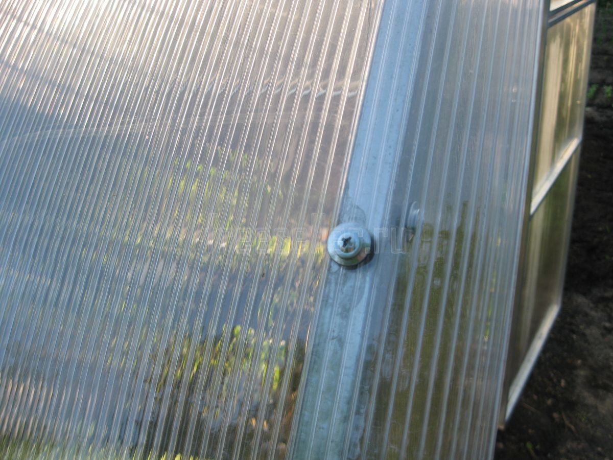 Однако от нашей старой, новая теплица выгодно отличается своей конструкцией, поскольку, во-первых, сотовый поликарбонат на ней закрепляется снаружи, при помощи саморезов, а не как на старой – сквозными болтами.