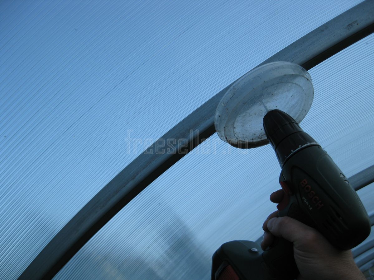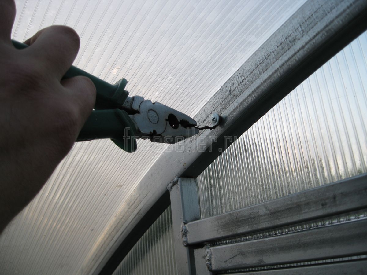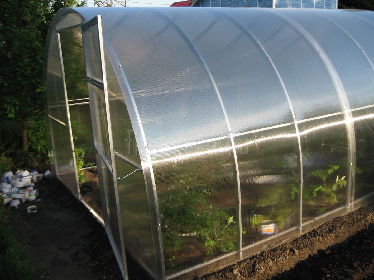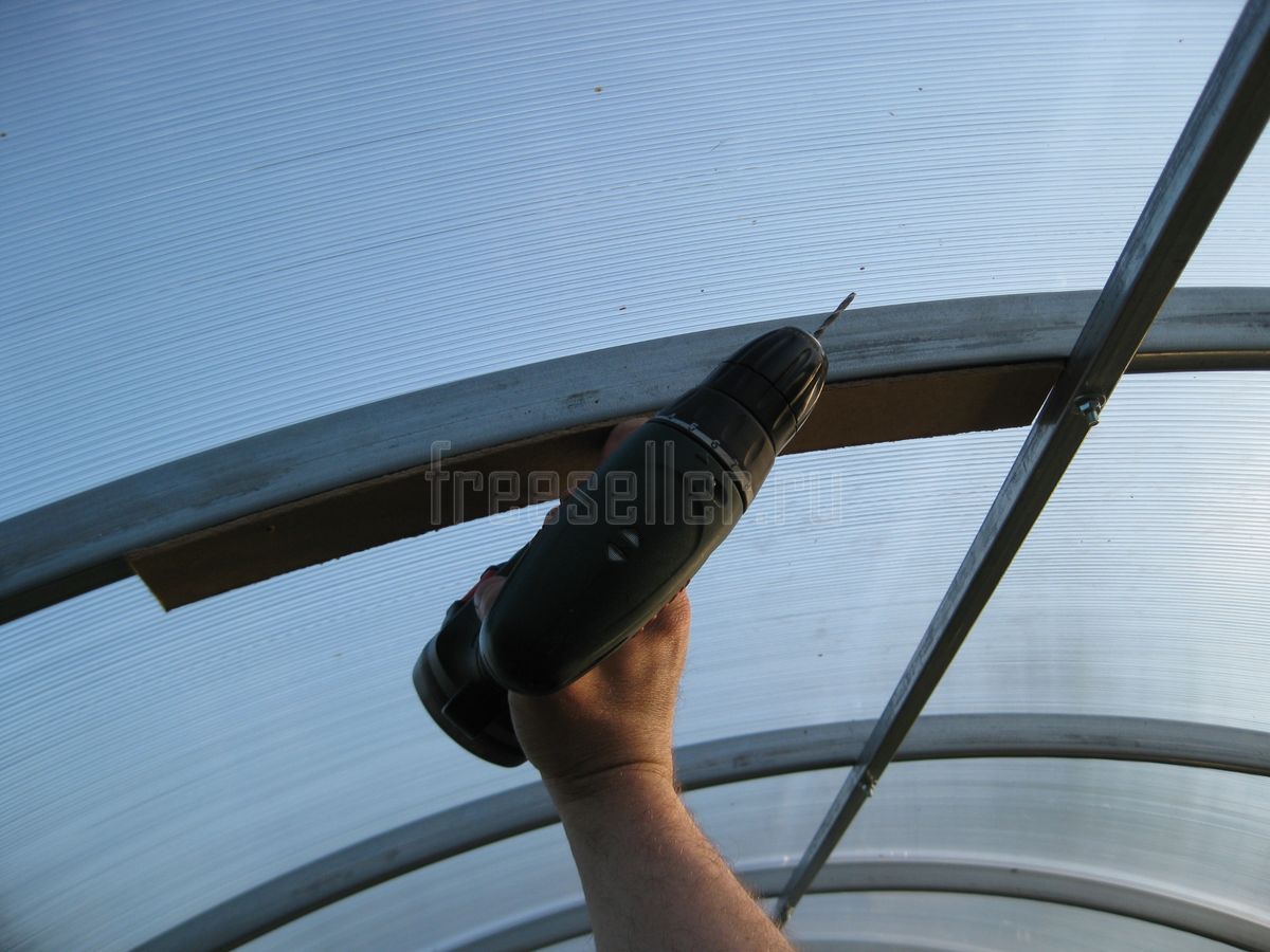 Однако от нашей старой, новая теплица выгодно отличается своей конструкцией, поскольку, во-первых, сотовый поликарбонат на ней закрепляется снаружи, при помощи саморезов, а не как на старой – сквозными болтами.