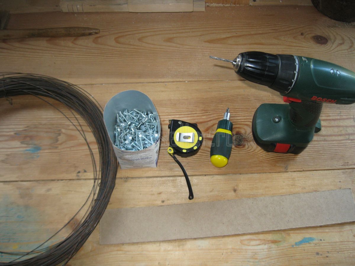Для этого мне понадобились аккумуляторная дрель-шуруповерт со сверлом по металлу диаметром 3 мм, реверсивная отвертка с битой РН2, рулетка, а также моток стальной проволоки диаметром 1,5 мм, шурупы с прессшайбой 4,2х20 мм, и небольшой отрезок оргалита.