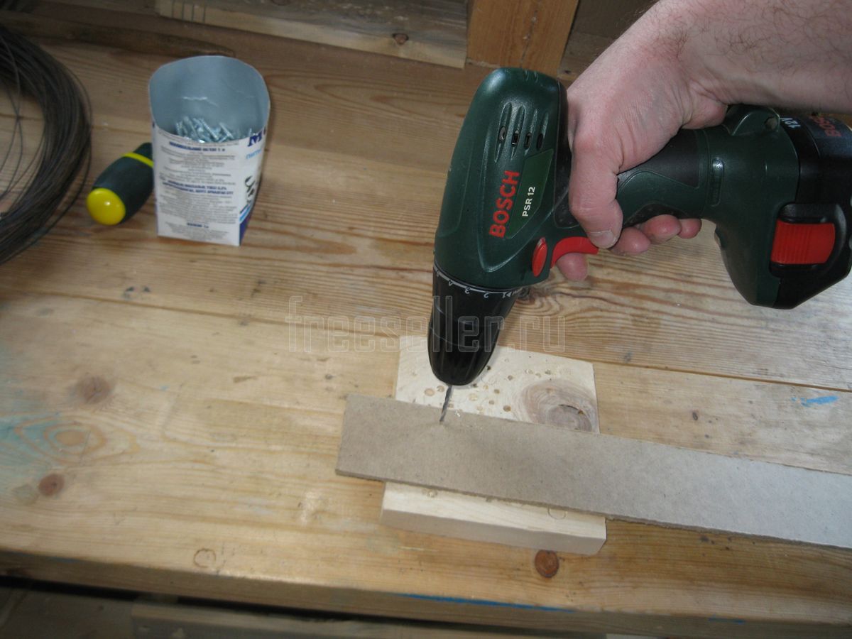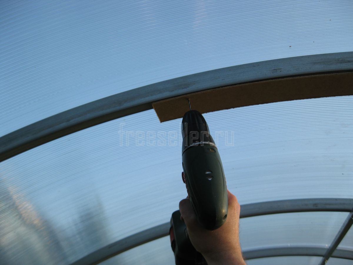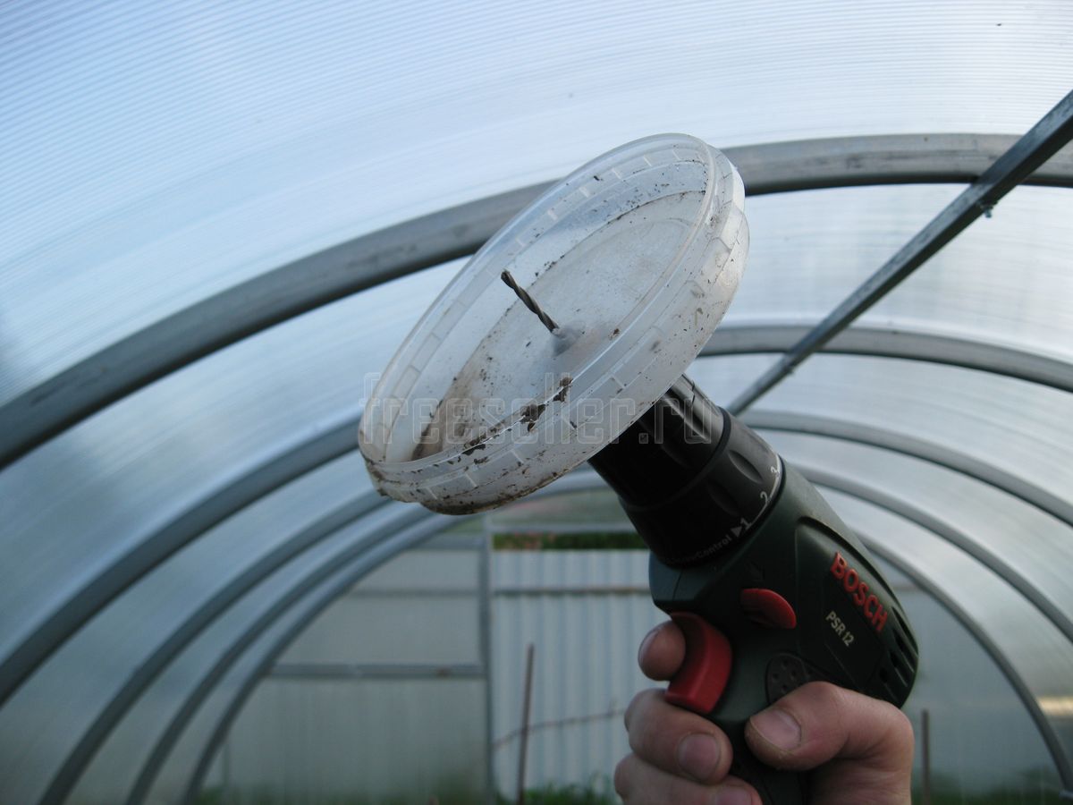 Для того чтобы каждый раз не отмерять нужное расстояние по дуге теплицы рулеткой, я сделал шаблон из отрезка оргалита, просверлив в нем отверстие.