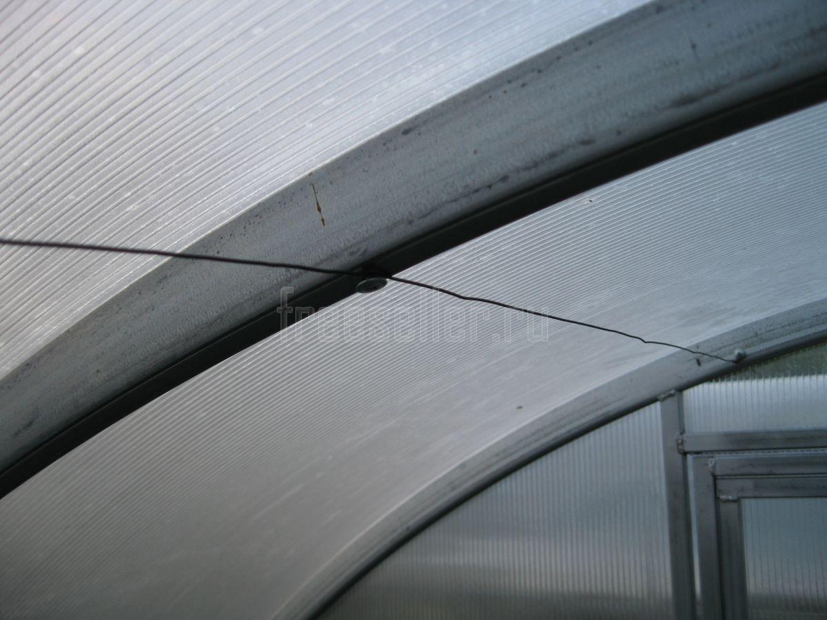 Небольшая доработка покупной теплицы из сотового поликарбоната, заключающаяся в установке проволочной шпалеры для подвязки растений.