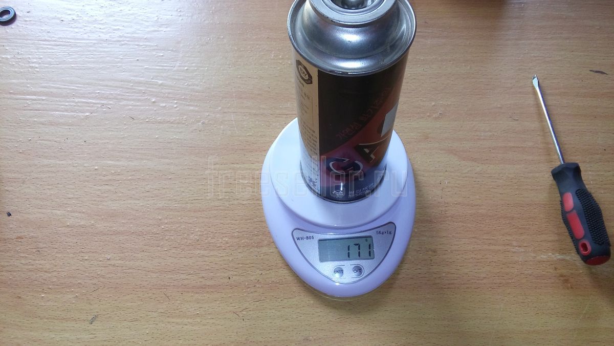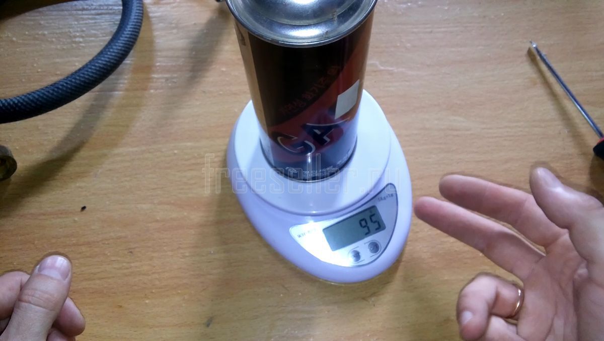 Заправляю я так: сперва выпускаю из баллончика весть оставшийся воздух, ставлю на весы. Вес пустого баллончика составляет 95 грамм. Затем подсоединяю баллончик к переходнику и открываю вентили. Большой баллон необходимо положить набок, что бы жидкий газ стек до краника. Я обычно заливаю от 150 до 180 грамм, не больше, для этого держу открытым клапан примерно 10 секунд. После заправки снова ставлю на весы и смотрю результат.