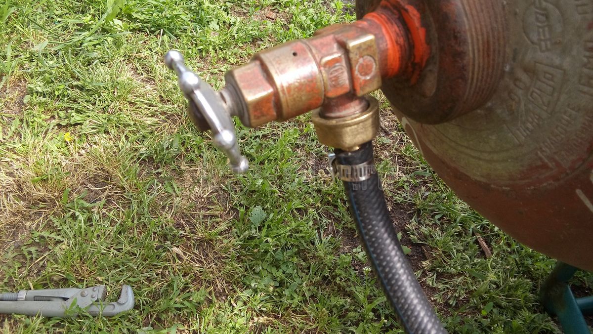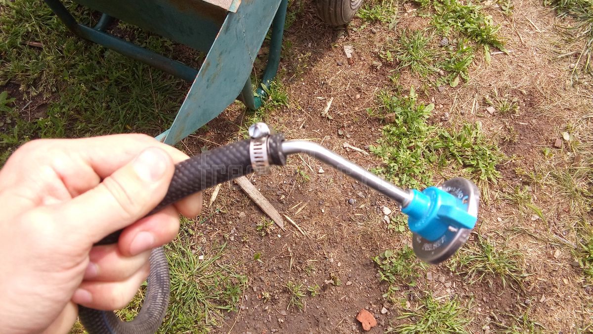 Затем берем шланг и один конец одеваем на переходник для большого газового баллона, а второй на горелку и хорошенько стягиваем хомутами.