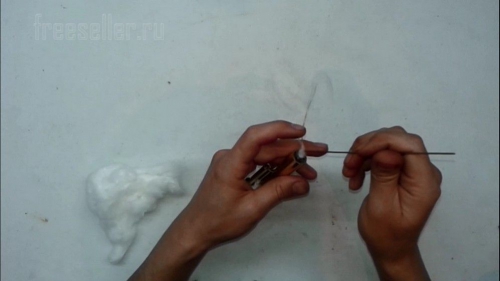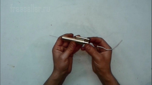 Для того что бы просунуть в отверстие фитиль, привязываем к нему тонкую медную проволоку и протягиваем его в отверстие.