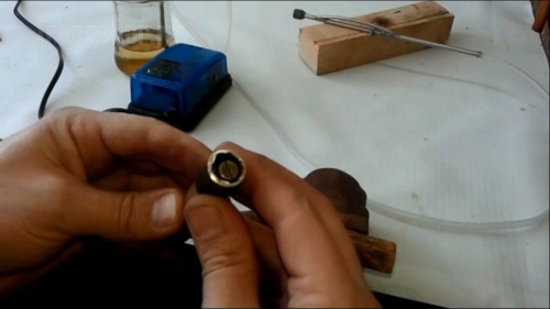 Первым делом откручиваем клапан насоса, извлекаем содержимое, а затем разбираем зажигалку, и оставляем только кресало, пружину с винтом и трубку в которой находится пружина.