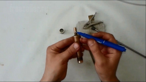 Верхнюю часть зажигалки подготовили, переходим к нижней части. Здесь колпачок будет поменьше. Для этого чуть ниже бокового отверстия клапана отмечаем линии среза клапана и трубки.
