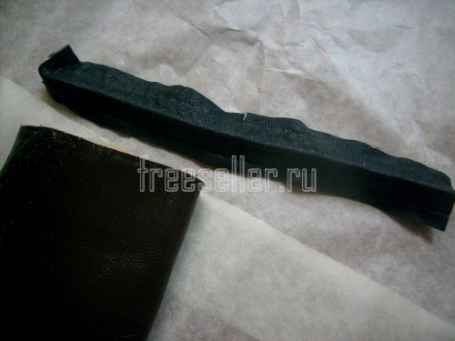 6. Выворачиваем изделие на лицо. Из тонкой кожи другого цвета выкраиваем полоску длиной 17 см и шириной 2,5 см.