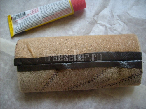 7. Аккуратно обшиваем полоской кожи верх футляра, сложив её вдвое по ширине, пряча срезы кожаной основы и подкладки внутри.