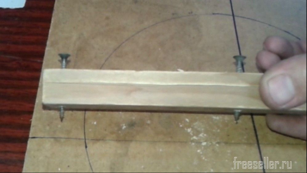 Диаметр будущего отверстия делим пополам и ставим две отметки на кусочке деревяшки.