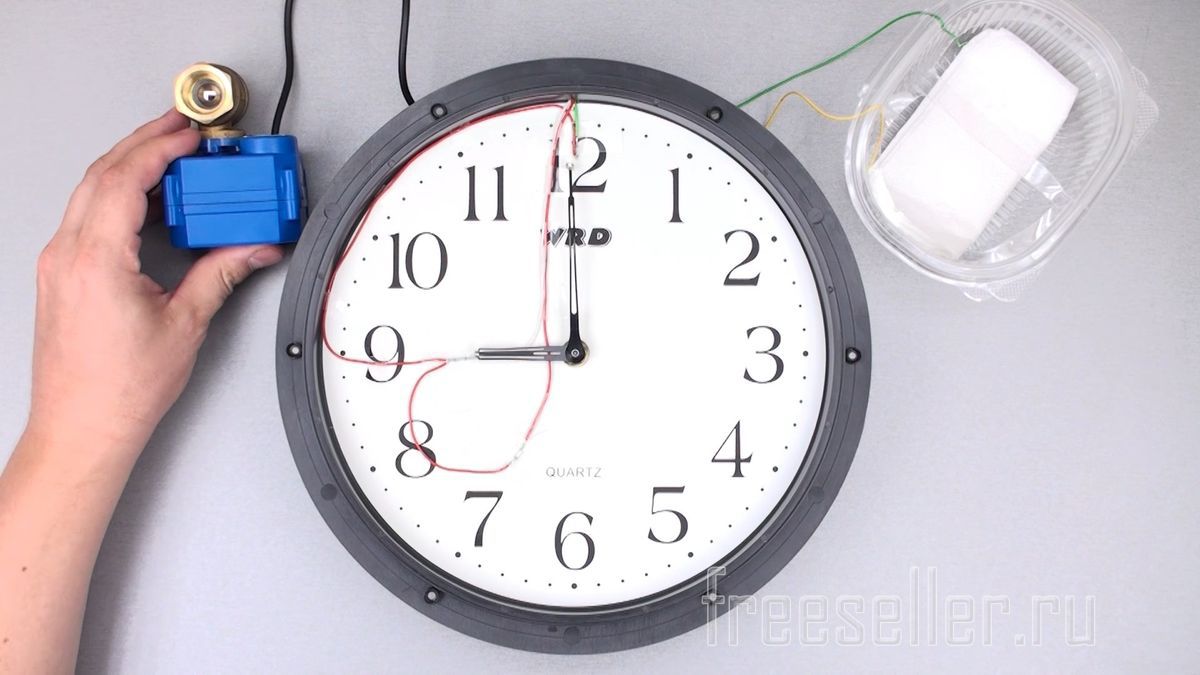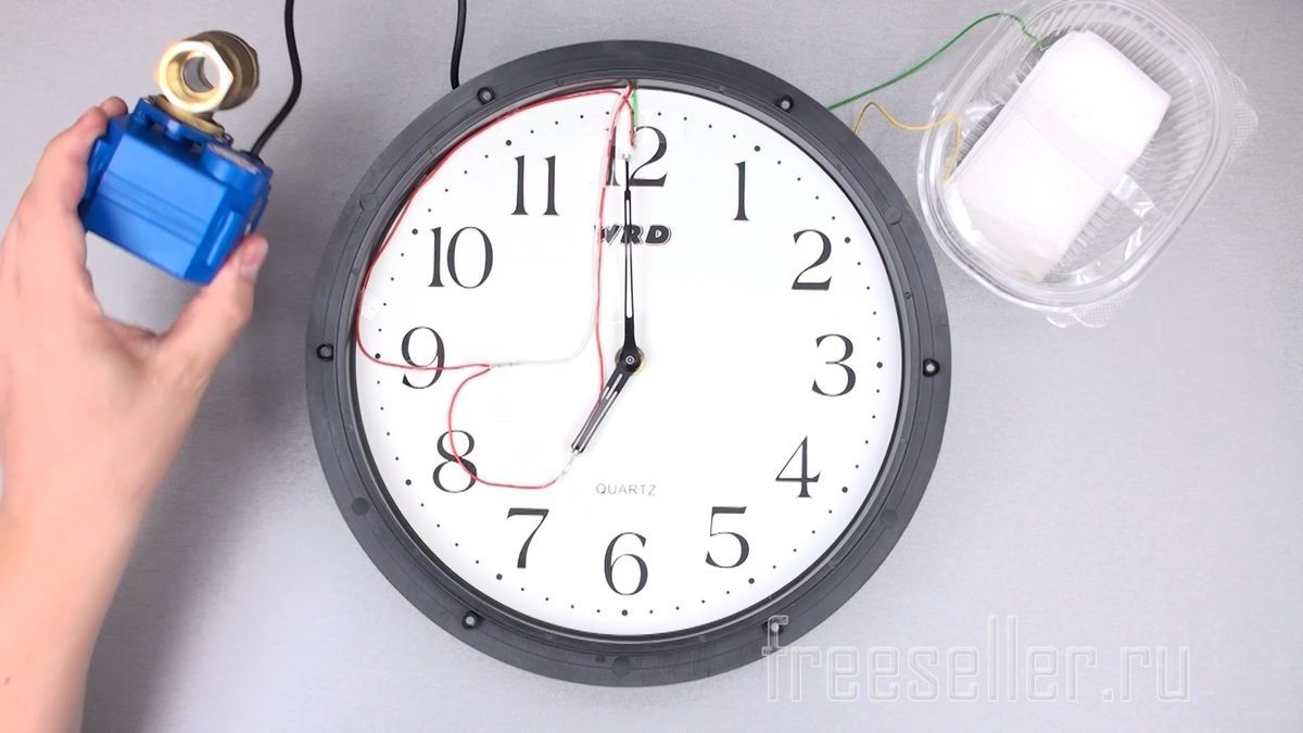 Когда стрелки будут на 12 и на 9, то ток через герконы закроет электро клапан.