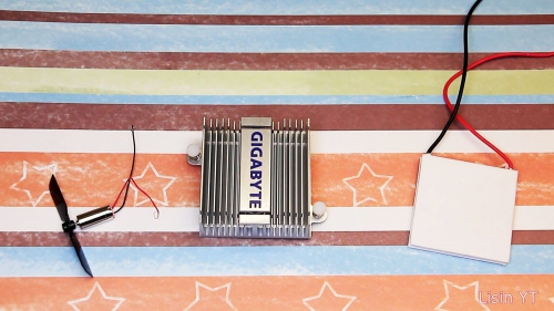 Для изготовления нам понадобится элемент Пельтье на 12 Вольт, небольшой радиатор и моторчик с пропеллером.