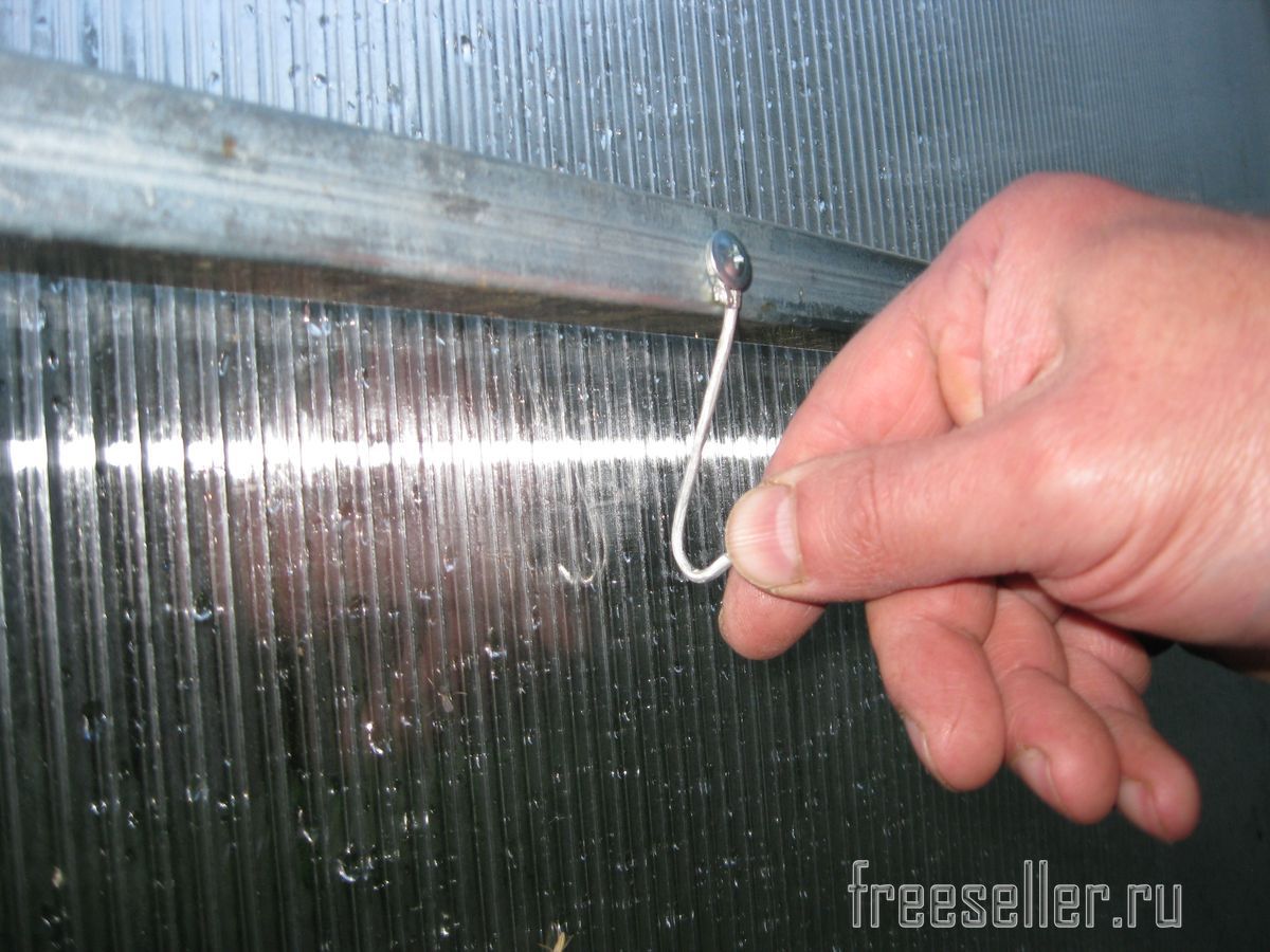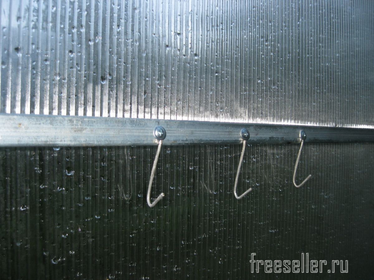 Каждый крючок, я немного отогнул внутрь, поближе к стенке из сотового поликарбоната, чтобы крючки не так торчали и таким образом, при работе в теплице меньше задевать их.