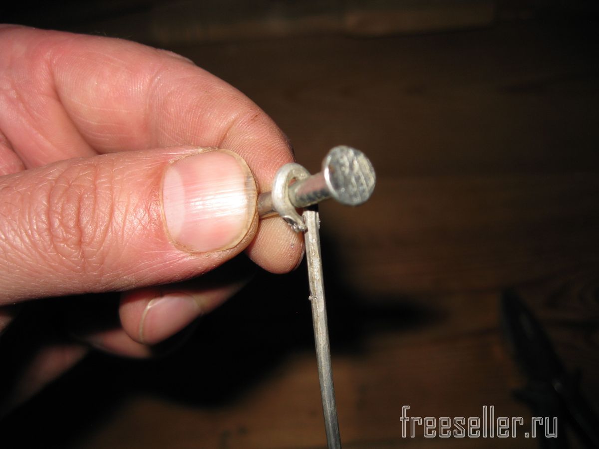На противоположных концах крючков, я сделал кольца, обжав их пассатижами на гвозде диаметром 4 мм, как на оправке.