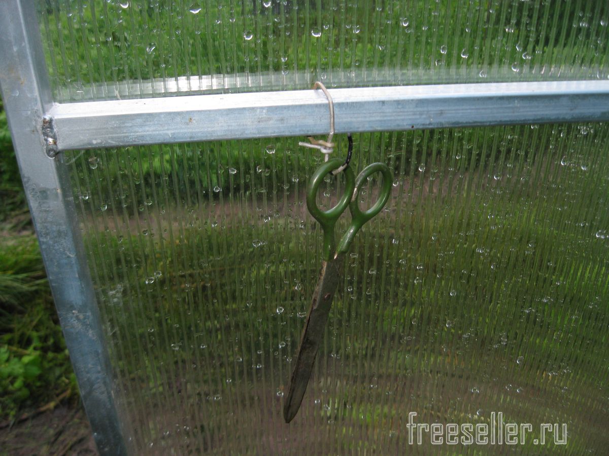 Поэтому очень желательно, чтобы перечисленный выше инструмент, постоянно находился в теплице. Однако тут возникает проблема размещения этого инструмента. Действительно, ведь в теплице нет ни вешалок, ни полок, чтобы можно было подвешивать или хранить данный инструмент. Чтобы выйти из этого положения, иногда приходится делать вешалки на скорую руку. Вот, например, кто-то из наших домашних, наскоро привязал к каркасу теплицы кусок проволоки, сделав из нее, вот такой крючок-вешалку.
