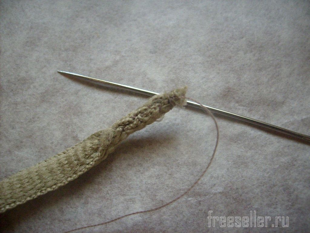 3. Сшиваем открытый конец одной половинки, прихватывая по очереди края шнурка и туго стягивая их вместе на участке длиной с готовый наконечник. Закрепляем и обрезаем нить.