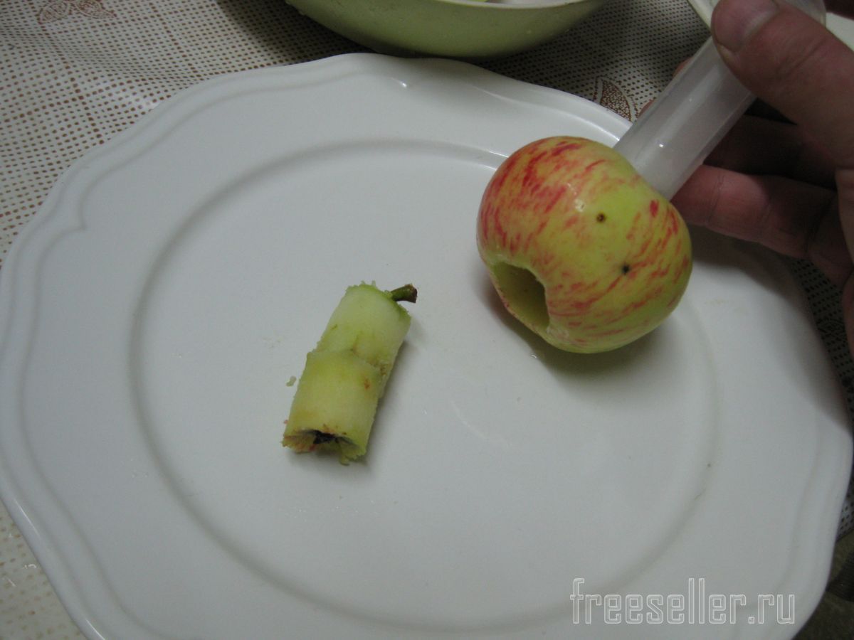 Для того чтобы вырезать таким устройством сердцевину яблока, надо прижать зубчатый венец шприца к яблоку с одной из сторон, вдоль продольной оси, вокруг которой в яблоке располагаются семена и несколько раз прокрутить шприц, одновременно углубляя его в яблоко примерно до середины.