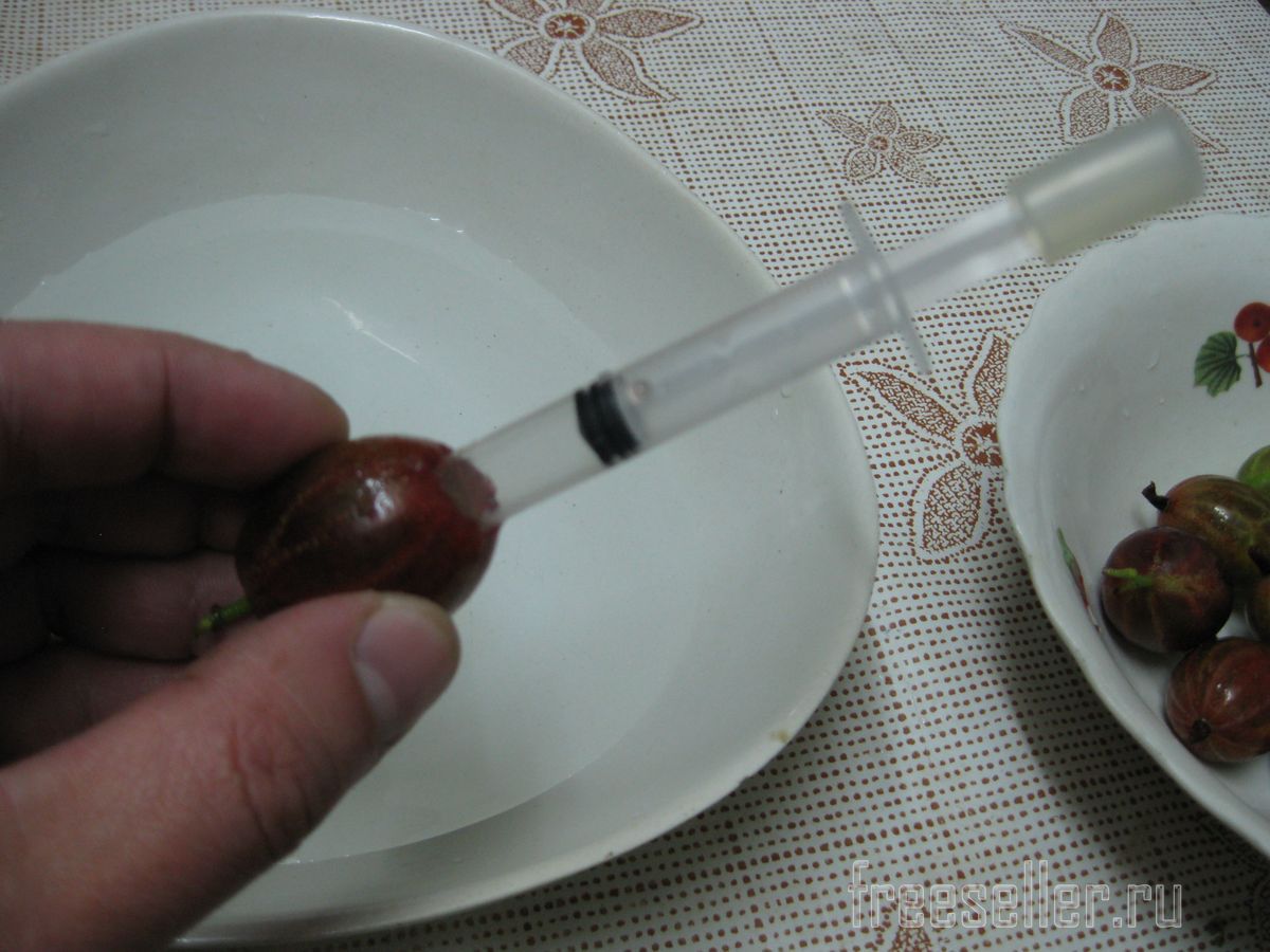 Именно поэтому, специально для чистки крыжовника, я сделал точно такое же устройство, как и описанное выше, но только из меньшего по размеру медицинского шприца.