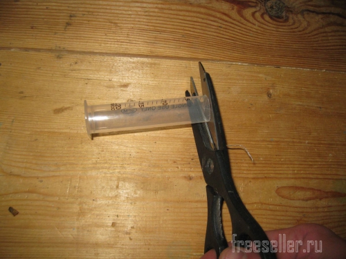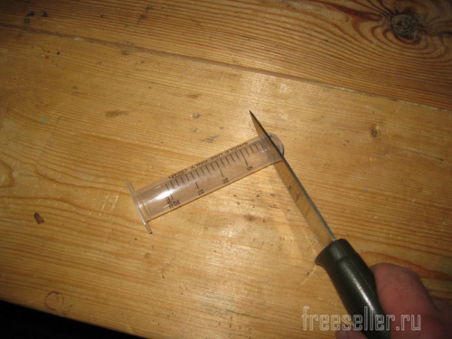 Сначала я отрезал у шприца дно с кончиком, на который одевается игла.