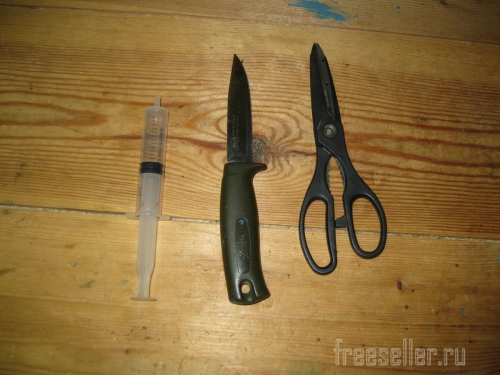 Для этого мне понадобились сам шприц емкостью 20 мл, с поршнем, а также острый нож и мощные ножницы.