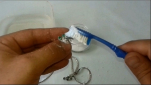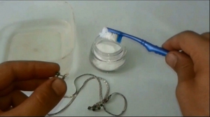 Нужно слегка увлажнить зубную щетку и избавиться от излишков воды. Обволакивая щетку в соде, захватываем ее и натираем изделия.