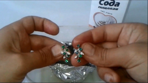 Укладываем изделия на фольгу, для сравнения одну серьгу я оставлю.